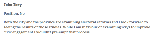 Again, Tory's answer here all seems to be that by dent of his great relations and awesome leadership skills, he can chivvy the province to agree. I don't know what Plan B is if this fails. Cancel the Scarborough subway? He probably should propose doing that given how SmartTrack more or less makes that line redundant given the existing routing of GO lines in Scarborough, but unlike Finch & Sheppard, Tory has been definitive in committing to build the Scarborough subway extension, so it would be a big promise break to reverse on that. But it would free up $3B in funding.